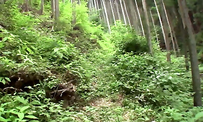 Brutish guy face fucks cute Japanese damsel in the middle of the woods